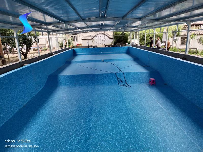 本項目位于河北邯鄲市,原基礎(chǔ)為馬賽克瓷磚,由于馬賽克瓷磚出現(xiàn)脫落問題,所以采用泳池膠膜更換改造,選擇1.5mm水波紋泳池膠膜,滿刮膠搭邊熱熔焊接工藝,整體效果如下: